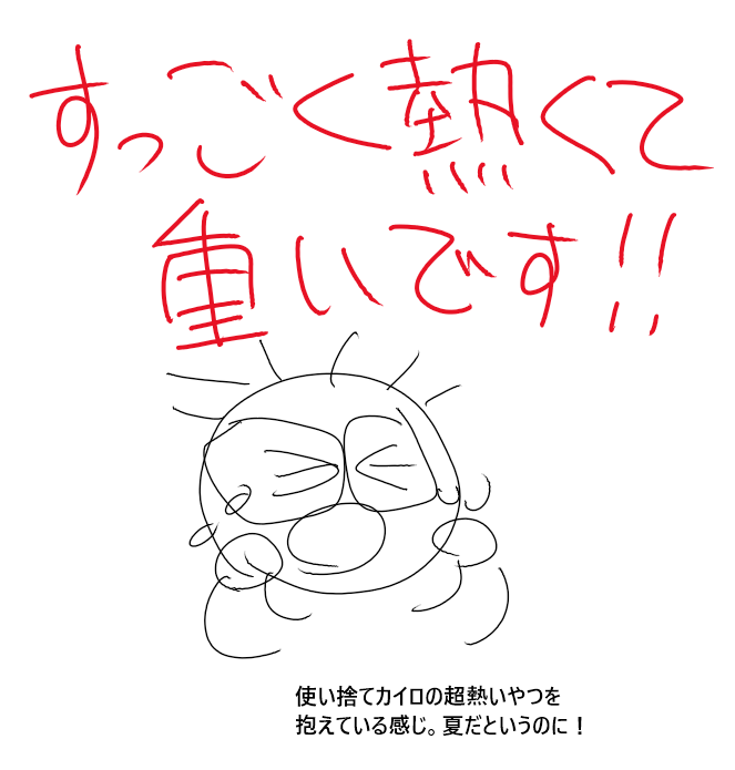 長時間、膝の上に乗せたりしようものなら確実にやけどします。本当に暑いです。真夏に使えません。ほんと、太ももの上に大きな熱々カイロを乗せているのを想像してみてください。