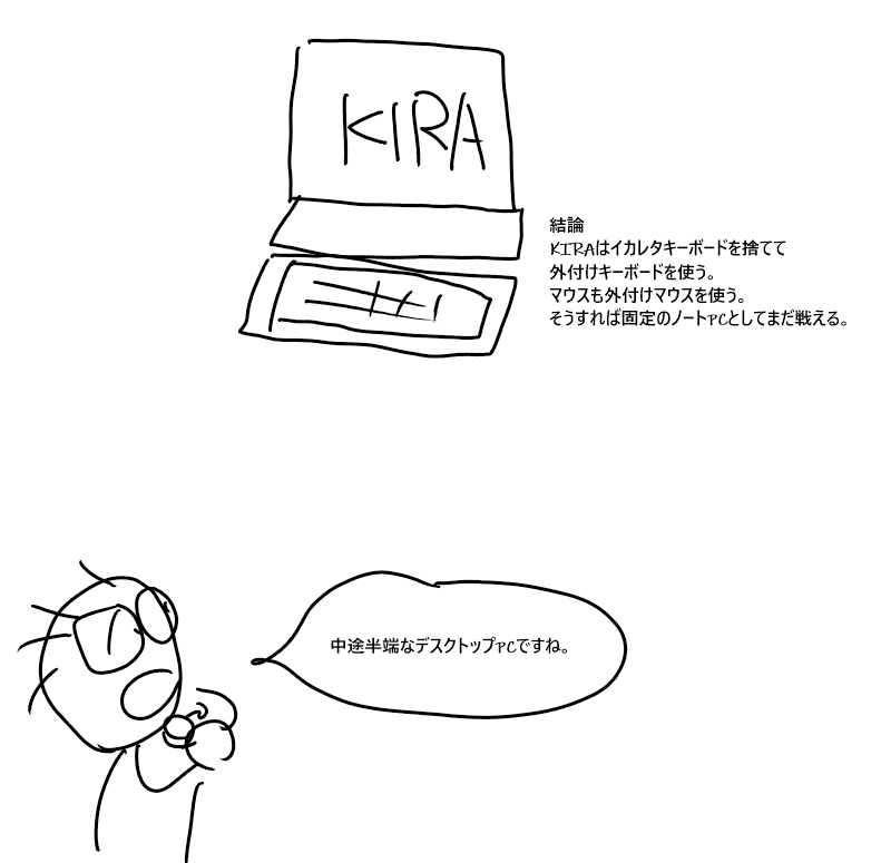 今回はKIRAで絵を描いて、何とかしてデスクトップPCに絵を移動させて、文章はデスクトップPCで入力する。というやり方を試しています。やっぱり文字入力はフルサイズのキーボードが至高です。