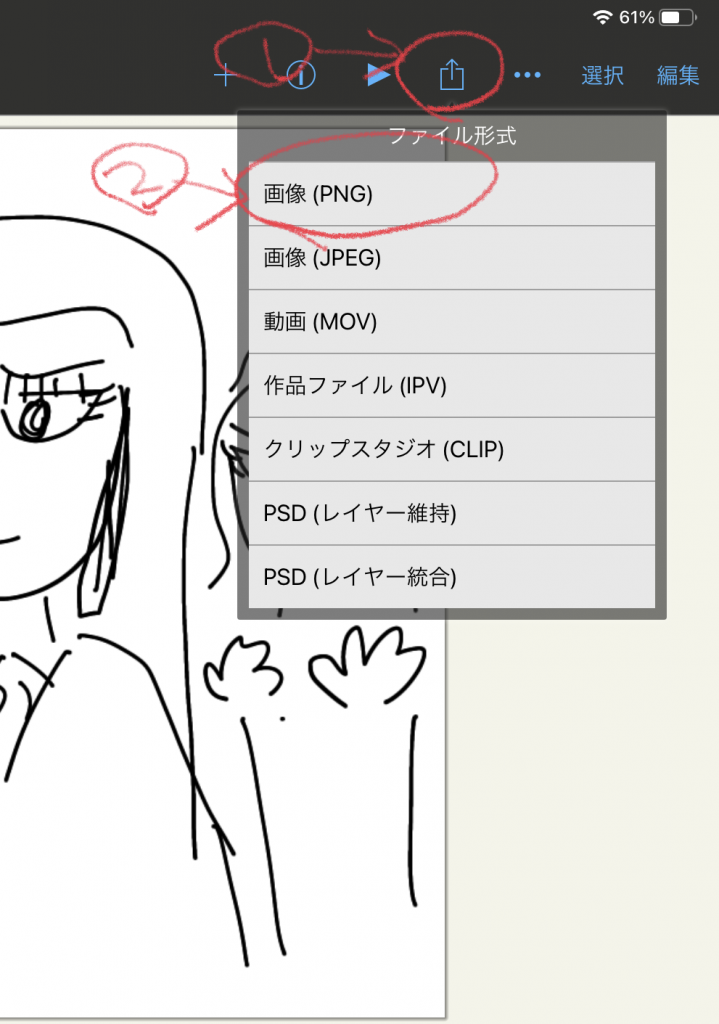 下の図のように、絵を描いてエクスポートボタンをタップして、PNGを選びました。