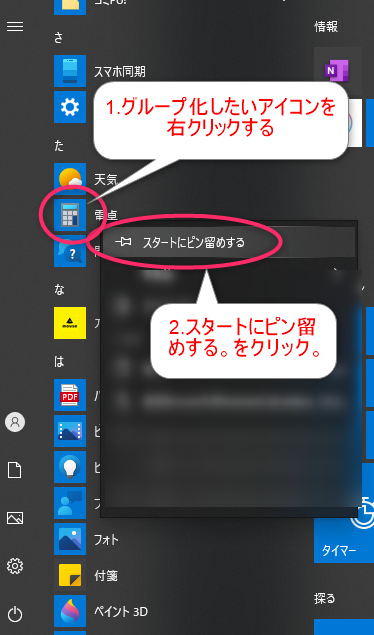 Windows10の標準の手順では、左側の一覧に表示されているアプリケーションのアイコンを右クリックしてメニューを選択すれば、スタートグループの右側にアプリケーションの起動アイコンを登録できます。こんな感じで↓