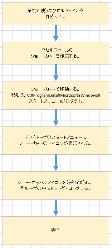 EXCELファイルじゃなくても、テキストファイルへのショートカットをスタートメニューに登録しても構いません。簡単に業務の流れをメモするのアリだと思います。