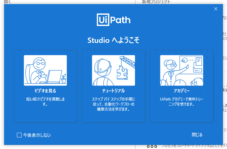 インストールするとスタートにUiPathの起動アイコンが登録されます。とりあえず青いのをクリック!すると…
