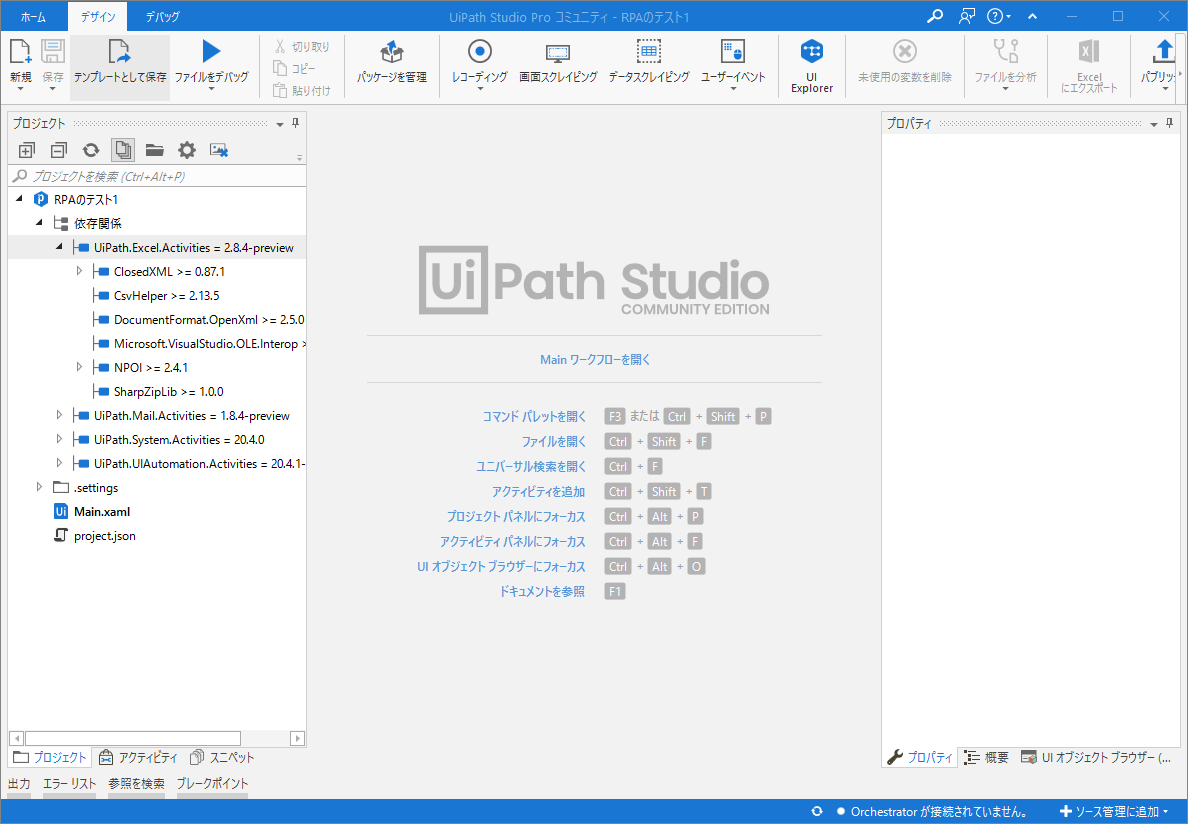 これでUiPathを使う準備が整いましたね。パット見た感じ「左のツリーに色々と字が書いてあって怖ーい」って印象です(笑)